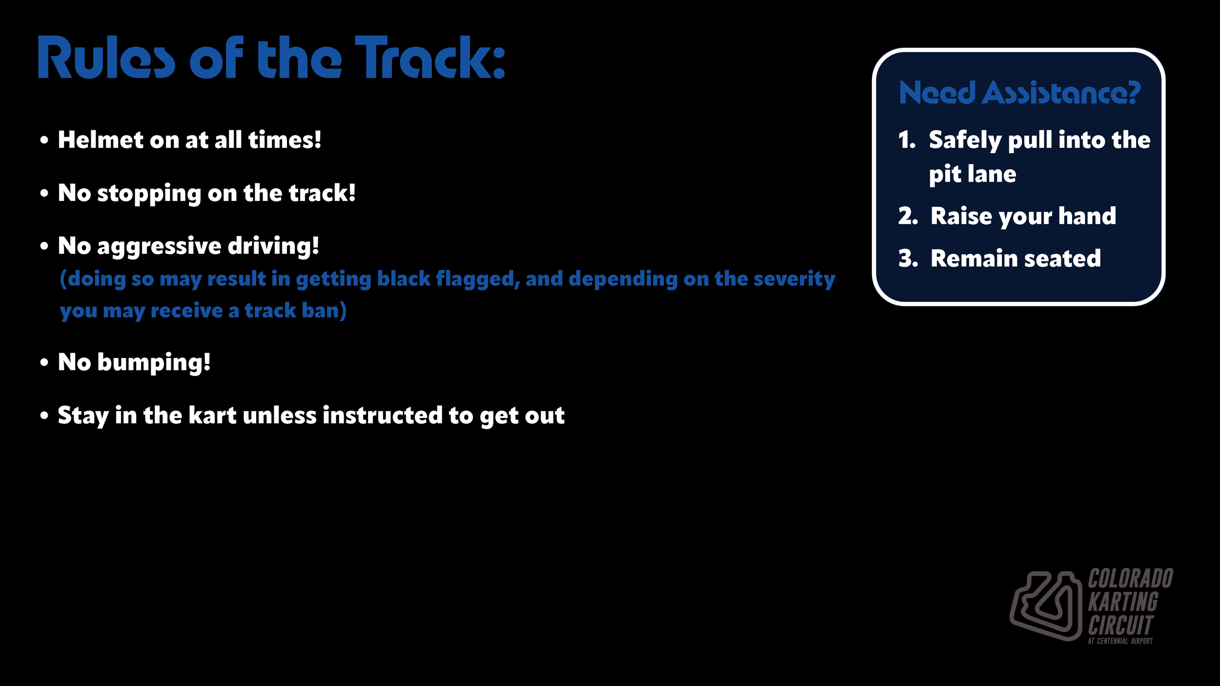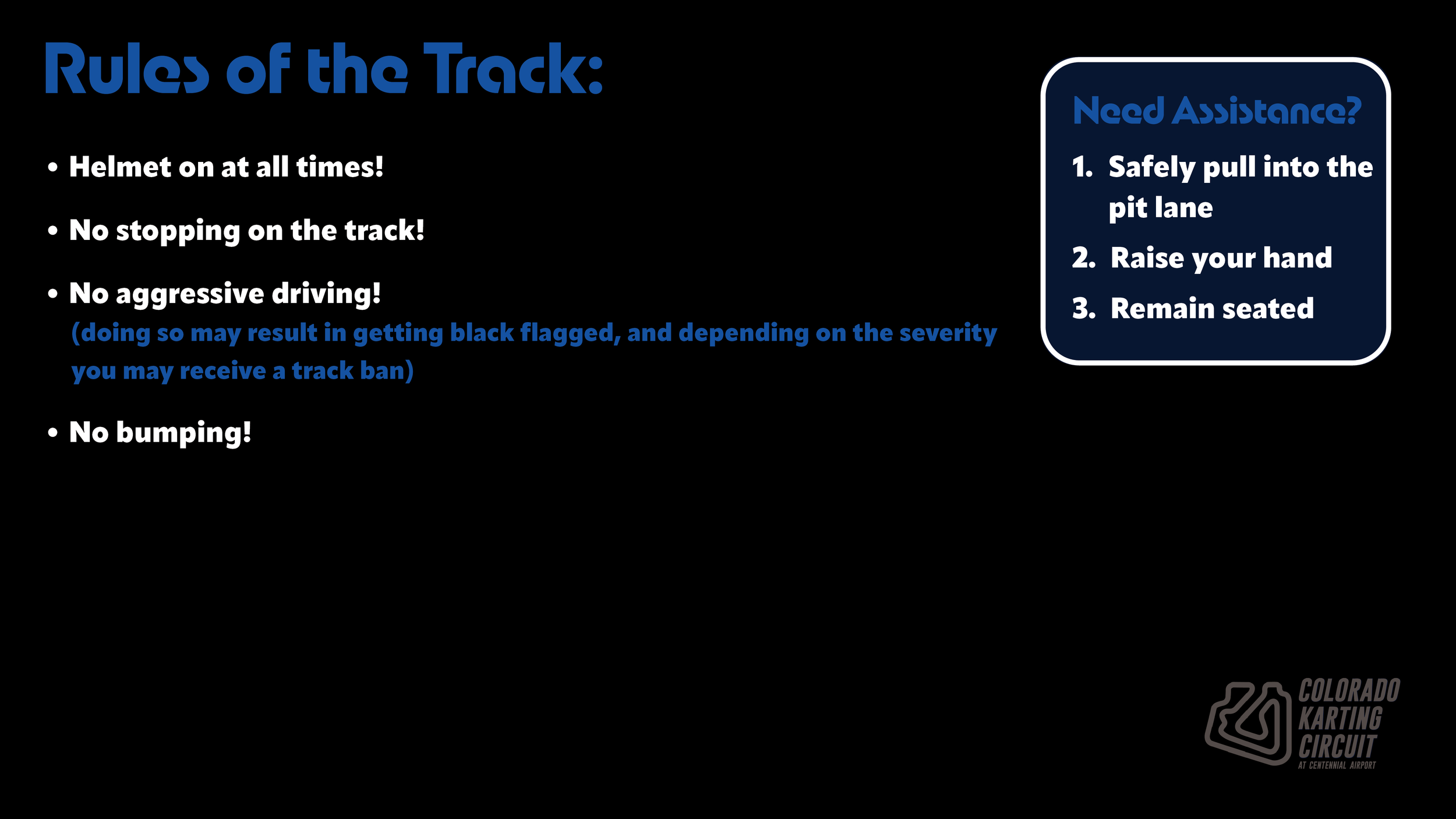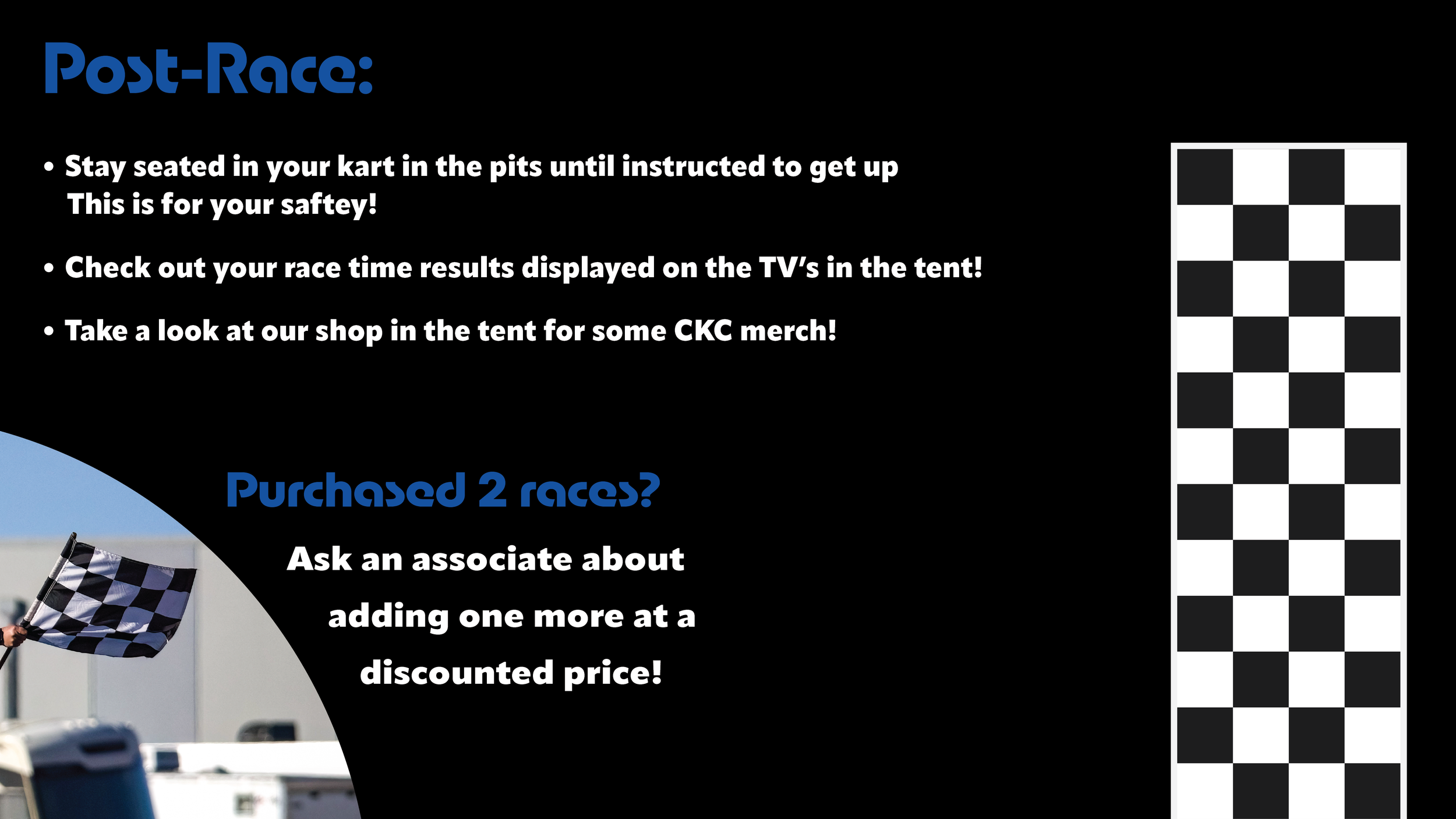CKC needed an efficient yet clear way to communicate the rules of the track, in order to ensure their customer’s safety. They requested me to create a 15-20 slide presentation that is shown to every customer before racing. This includes all information needed to maintain proper racing etiquette and what to do in any emergency situation, which was given to me by the staff. The main priority when creating this was to maintain easy legibility and highlight all information while maintaining the CKC theme and branding identity.