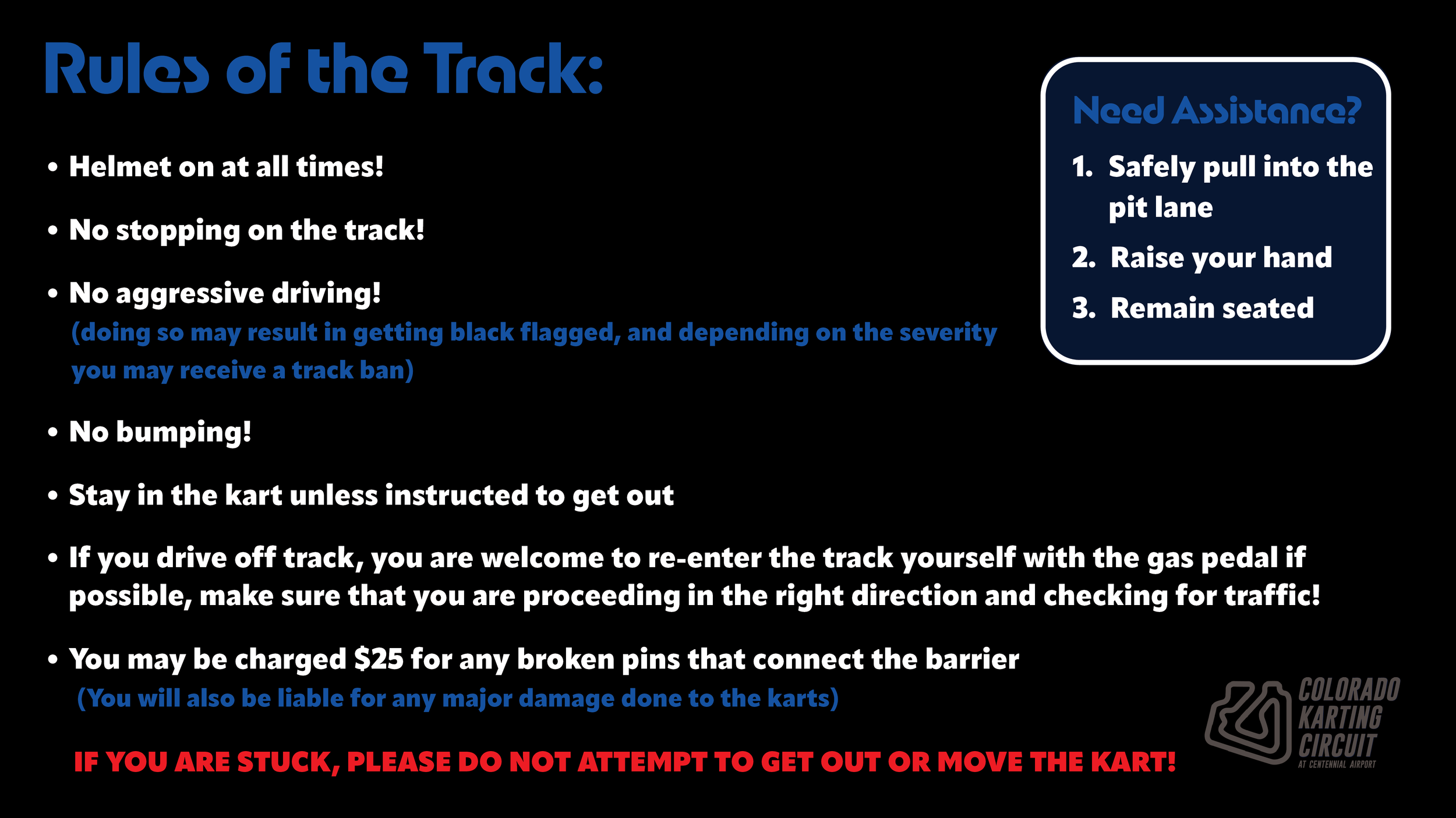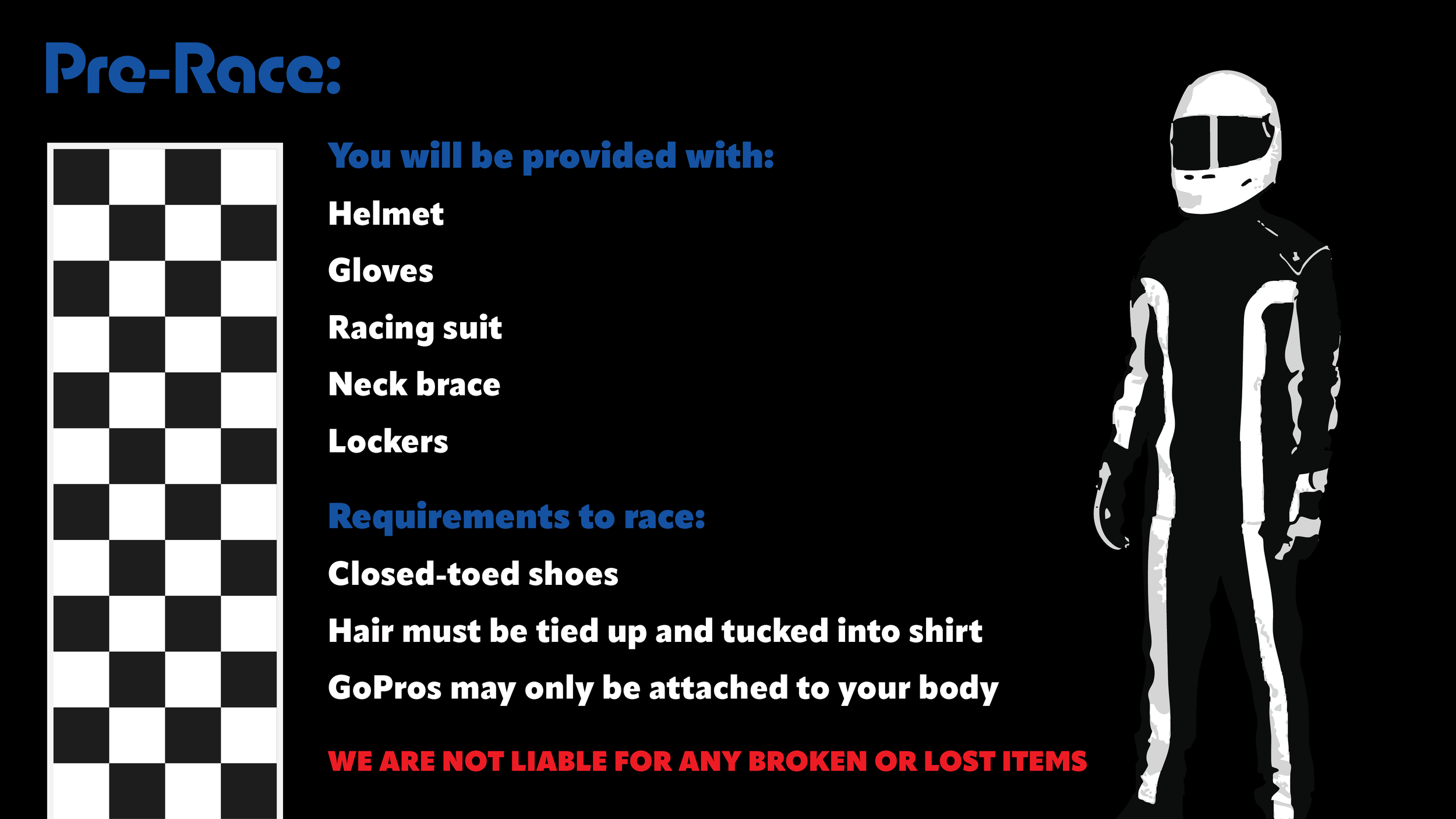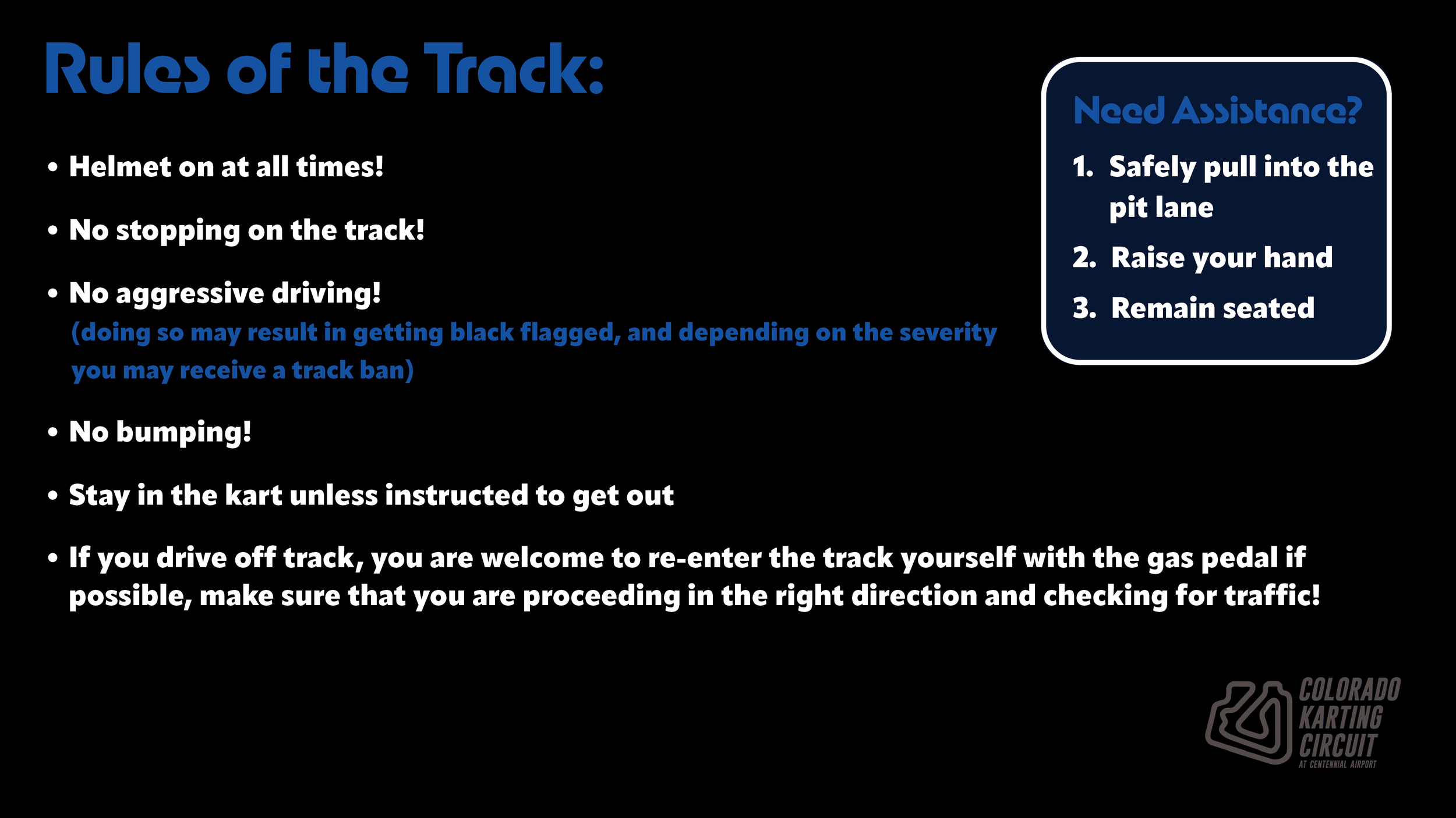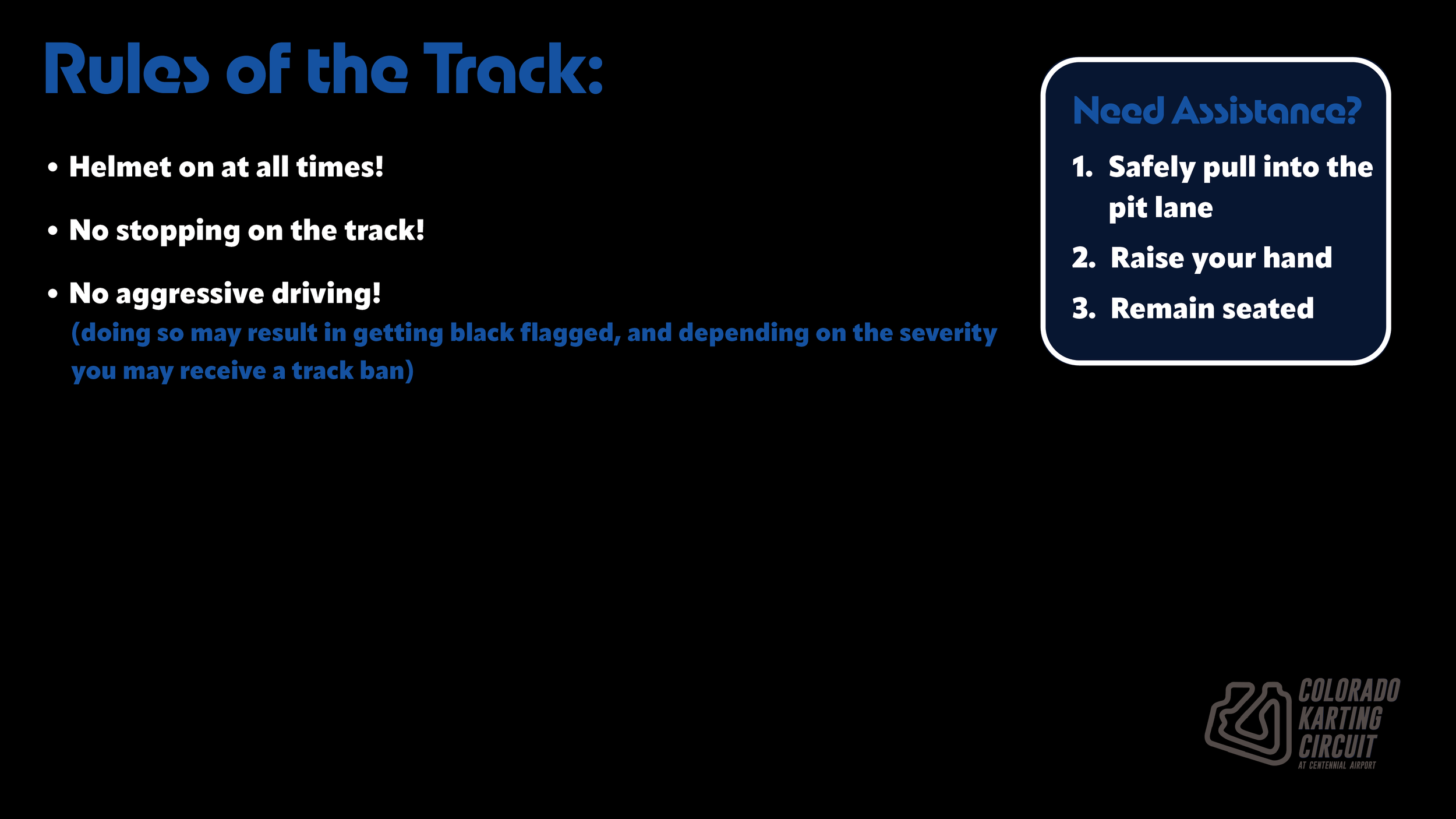 CKC needed an efficient yet clear way to communicate the rules of the track, in order to ensure their customer’s safety. They requested me to create a 15-20 slide presentation that is shown to every customer before racing. This includes all information needed to maintain proper racing etiquette and what to do in any emergency situation, which was given to me by the staff. The main priority when creating this was to maintain easy legibility and highlight all information while maintaining the CKC theme and branding identity.